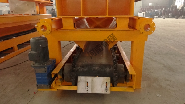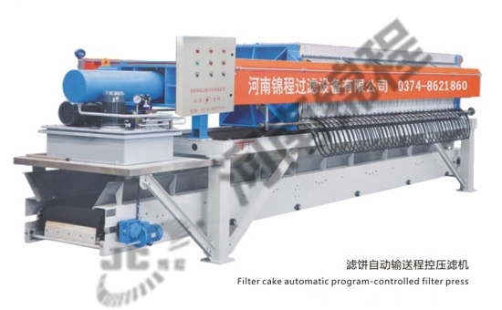 在液壓缸的作用下,壓濾機(jī)濾板沿主梁移動壓緊,使相鄰濾板間形成濾室,周邊密封。煤泥水經(jīng)人料泵以一定壓力從人料孔給人各濾室,借助人料泵的給料壓力在過濾介質(zhì)兩側(cè)形成的壓力差實現(xiàn)固液分離,煤泥顆粒滯留在濾室內(nèi),濾液透過過濾介質(zhì)從濾板的導(dǎo)水孔排出機(jī)外。經(jīng)過一段時間后,濾液不再流出,過濾脫水過程完成。停止入料,由鏈條拉開濾板,濾餅脫落后,由壓濾機(jī)下的刮板輸送機(jī)或膠帶機(jī)運走。